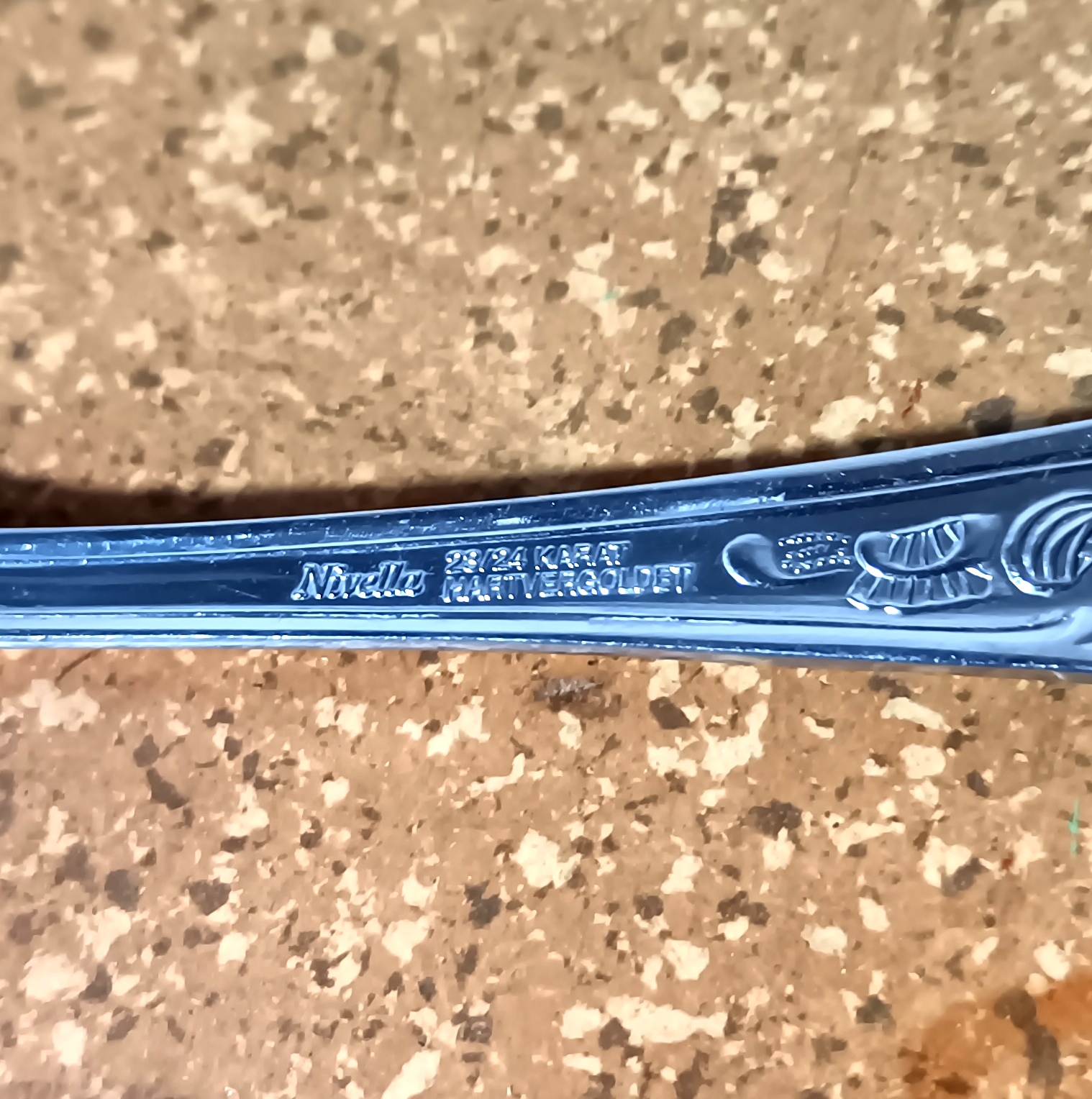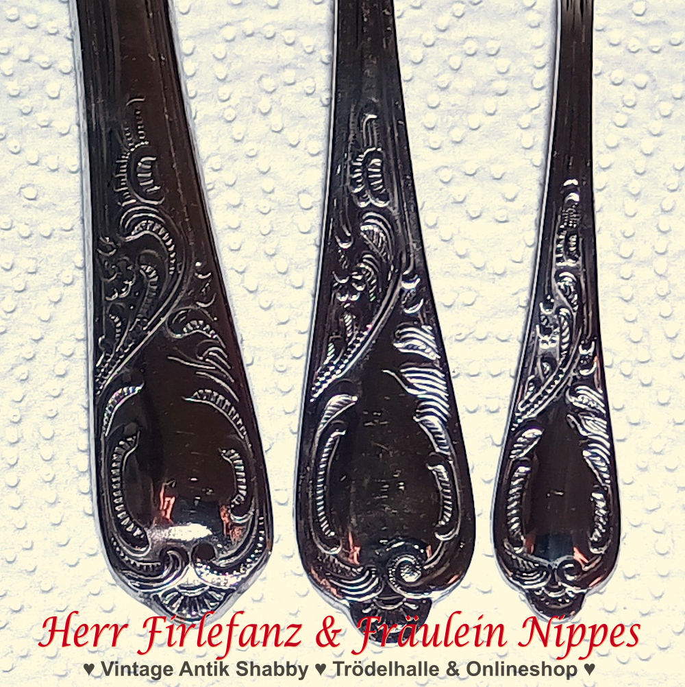 Dieses hübsche Besteck von Nivella ist silberfarben (23/24 Karat hartvergoldet) und hat am Griff ein Dekor im Antik Stil.