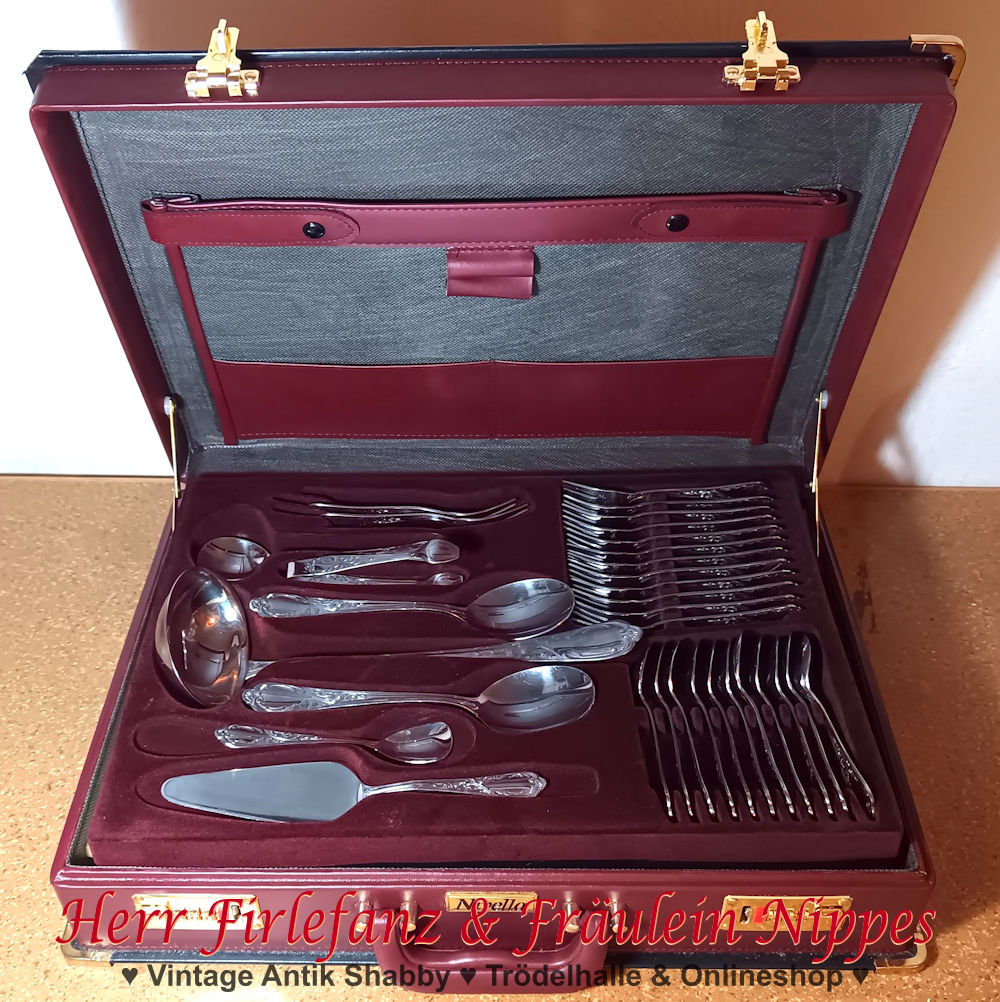 Es wird inkl. braunem Besteckkoffer aus Kunstleder geliefert.