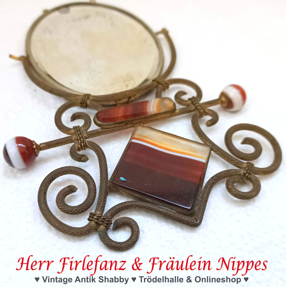 Der Rahmen dieses hübschen alten Handspiegels ist goldfarben und besteht aus gebogenen und verzierten Messingstäben.