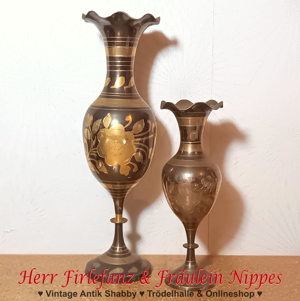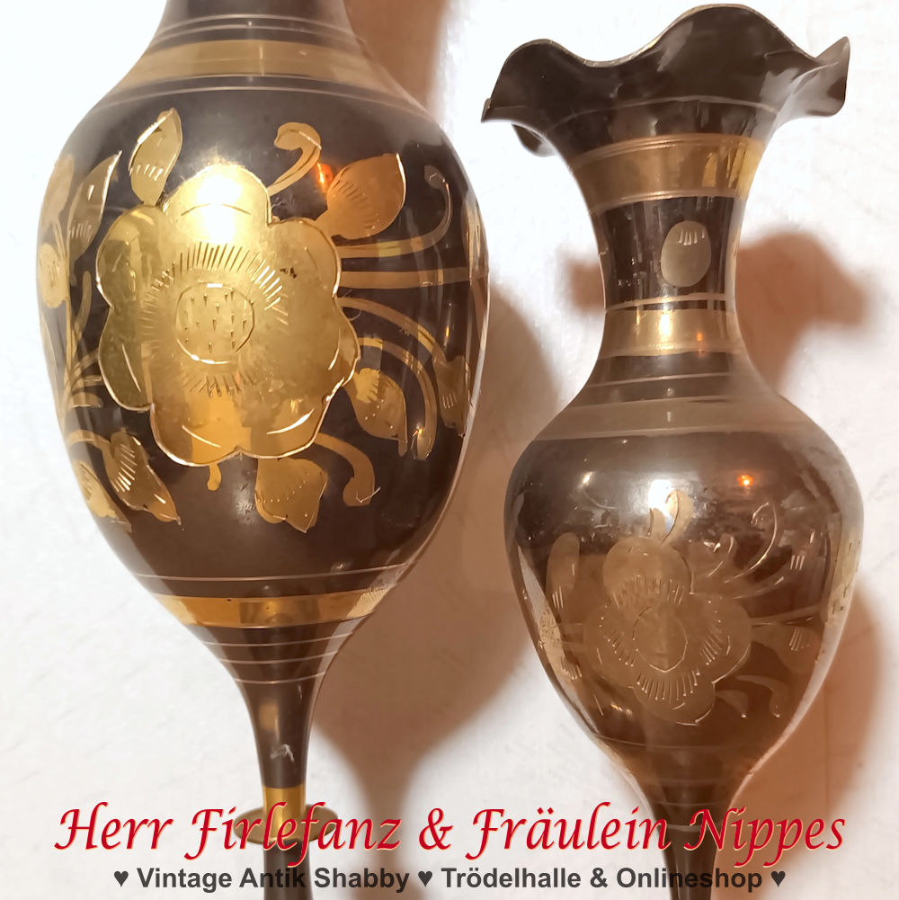 Diese beiden hübschen Vasen bestehen aus Messing und haben ein eingeritztes (ziseliertes) Dekor aus Blumen.