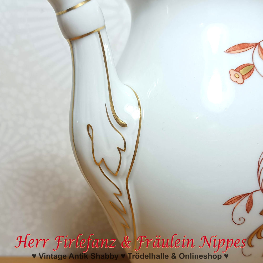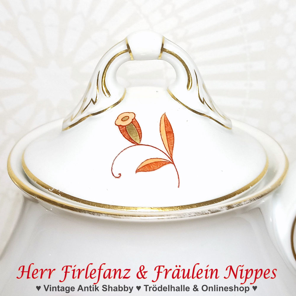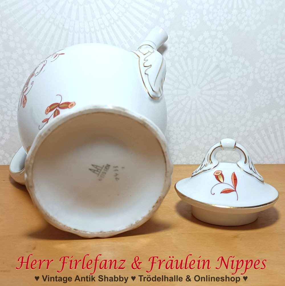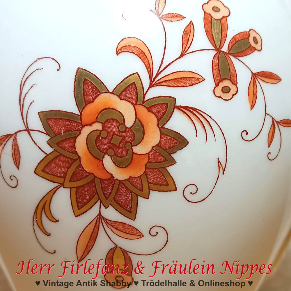 Sie besteht aus weißem Porzellan und hat hat typisches 20er Jahre Dekor in rostrot, lachs und gold.
