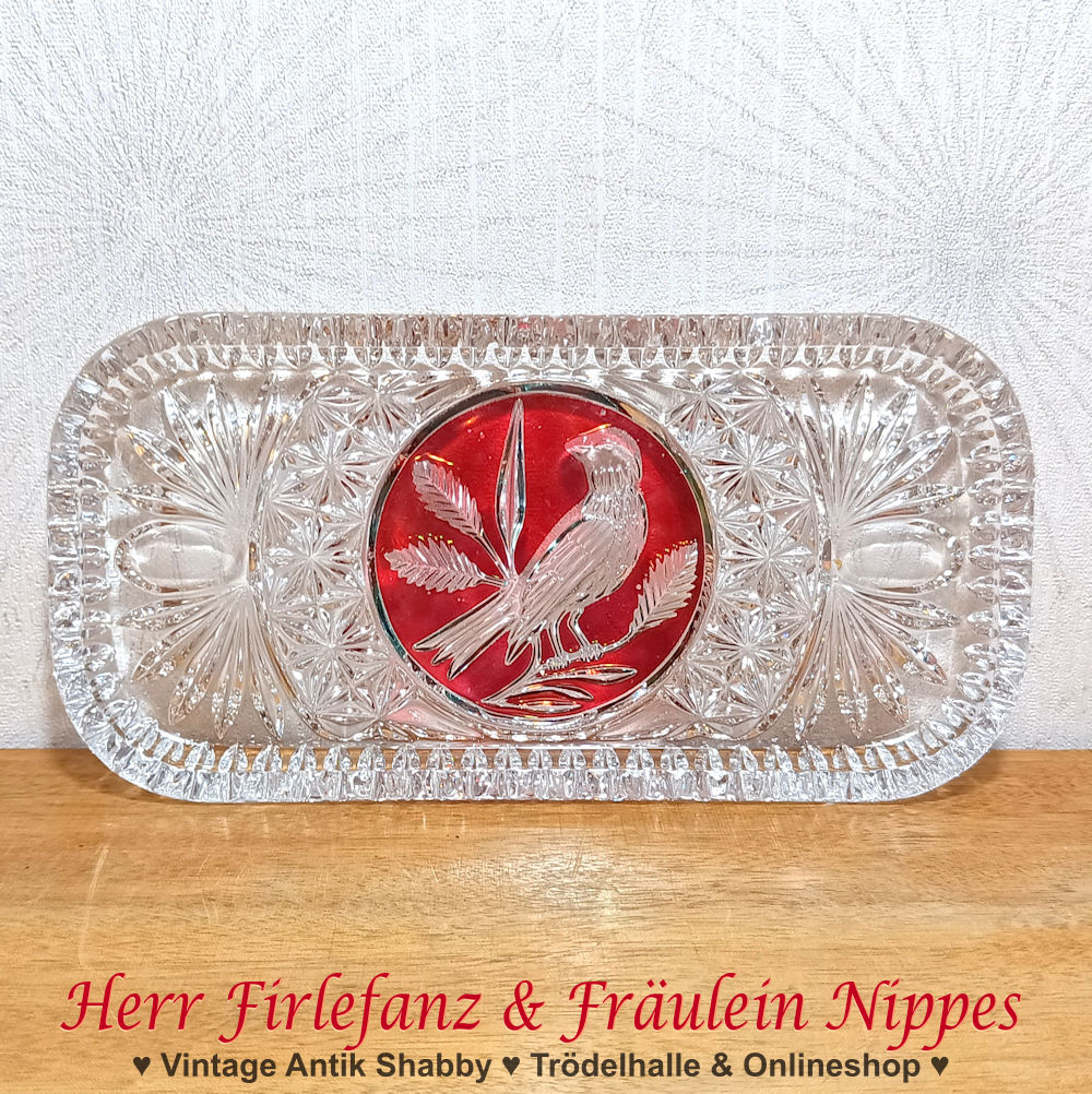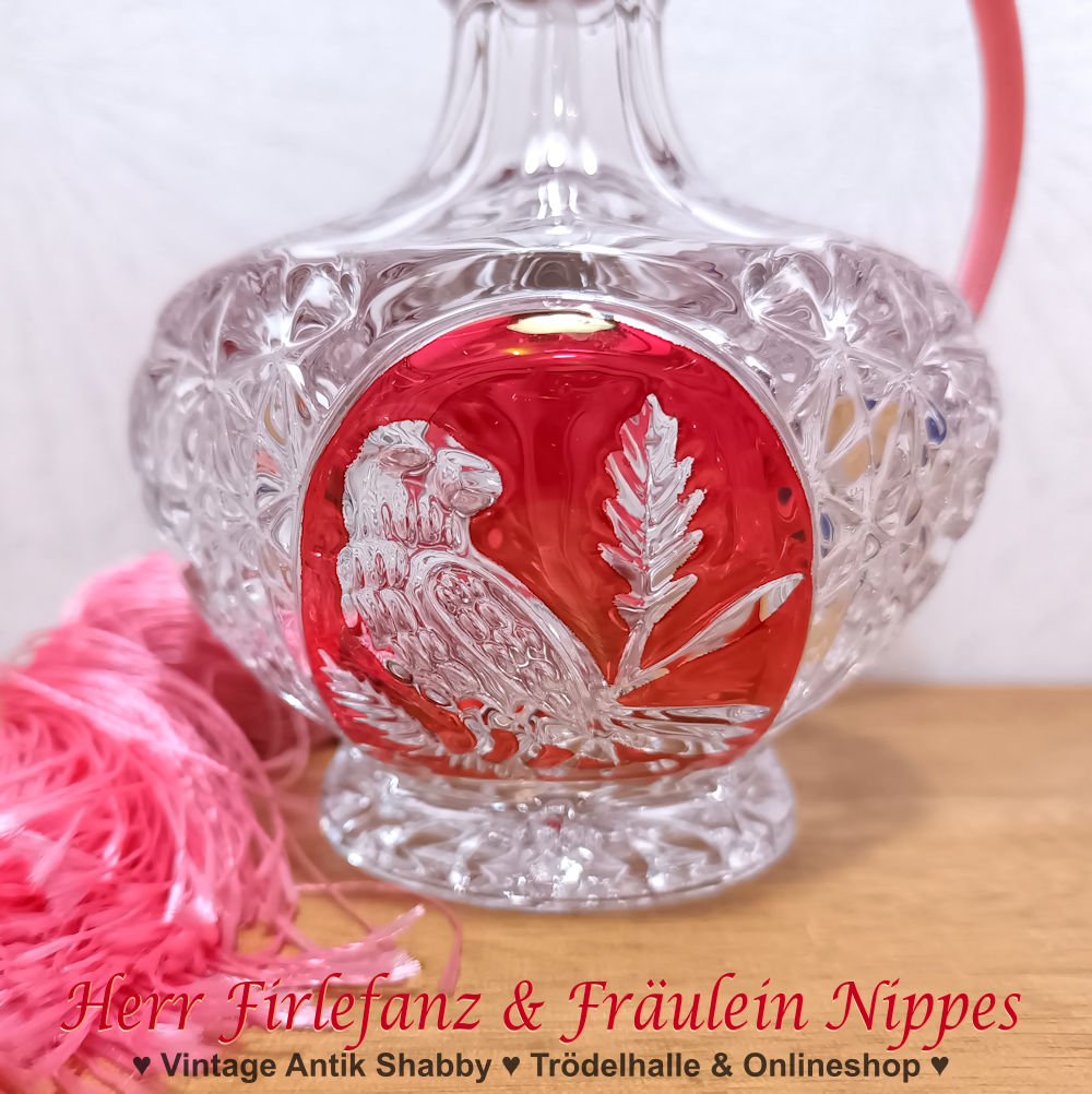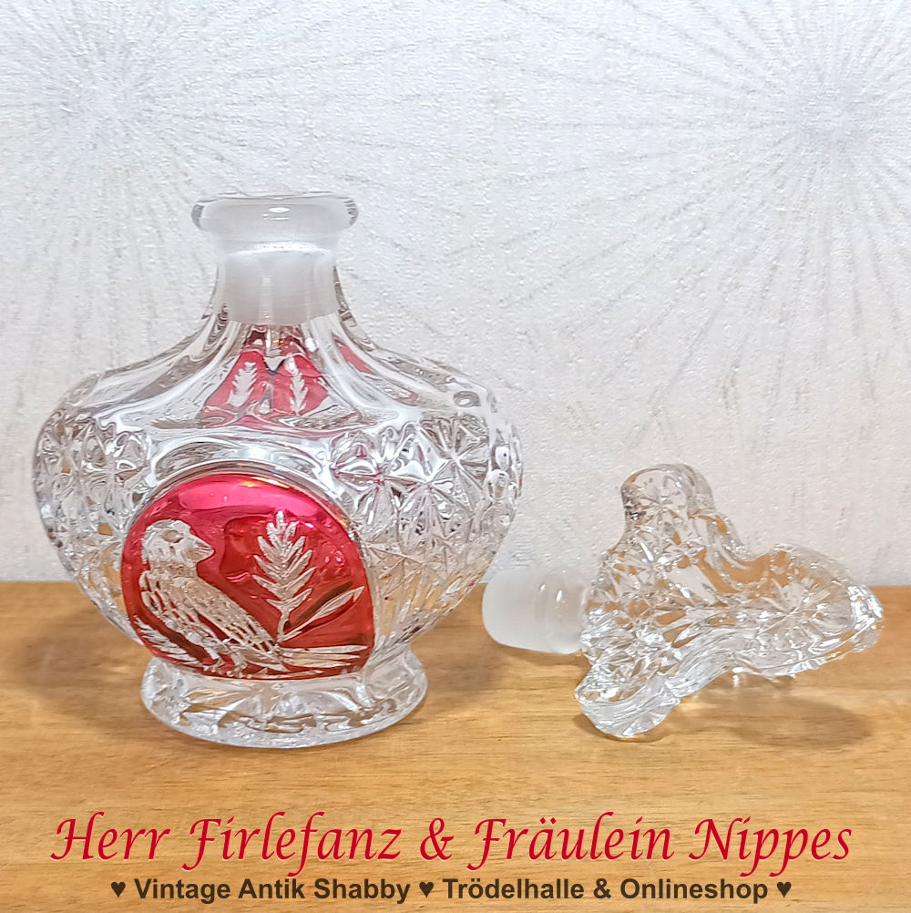 Dieses hübsche Parfüm Set der Firma Hofbauer besteht aus Bleikristall und hat seitlich rote Kartuschen mit einem Vogel (Red Bird).