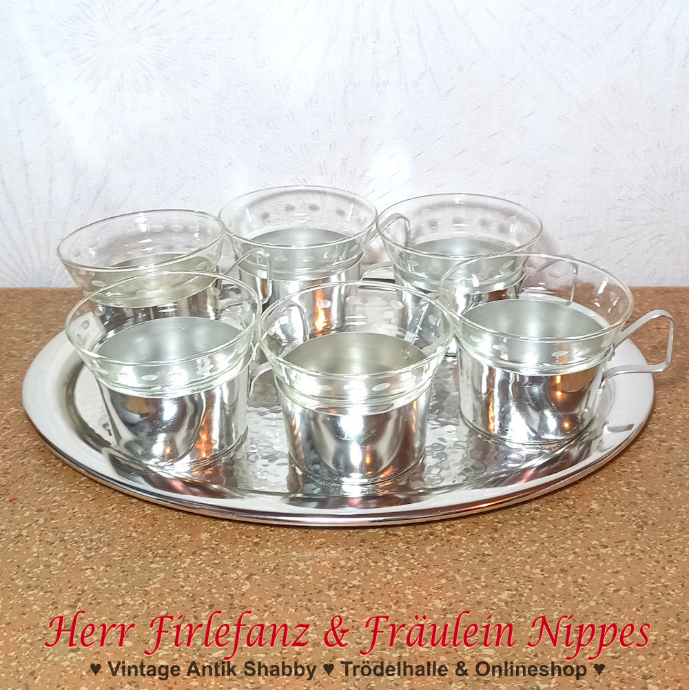 Diese Vintage Teegläser aus den 50er / 60er Jahren bestehen aus einem Glas und einem Napf aus Metall - insbesondere silberfarben eloxiertem Aluminium.