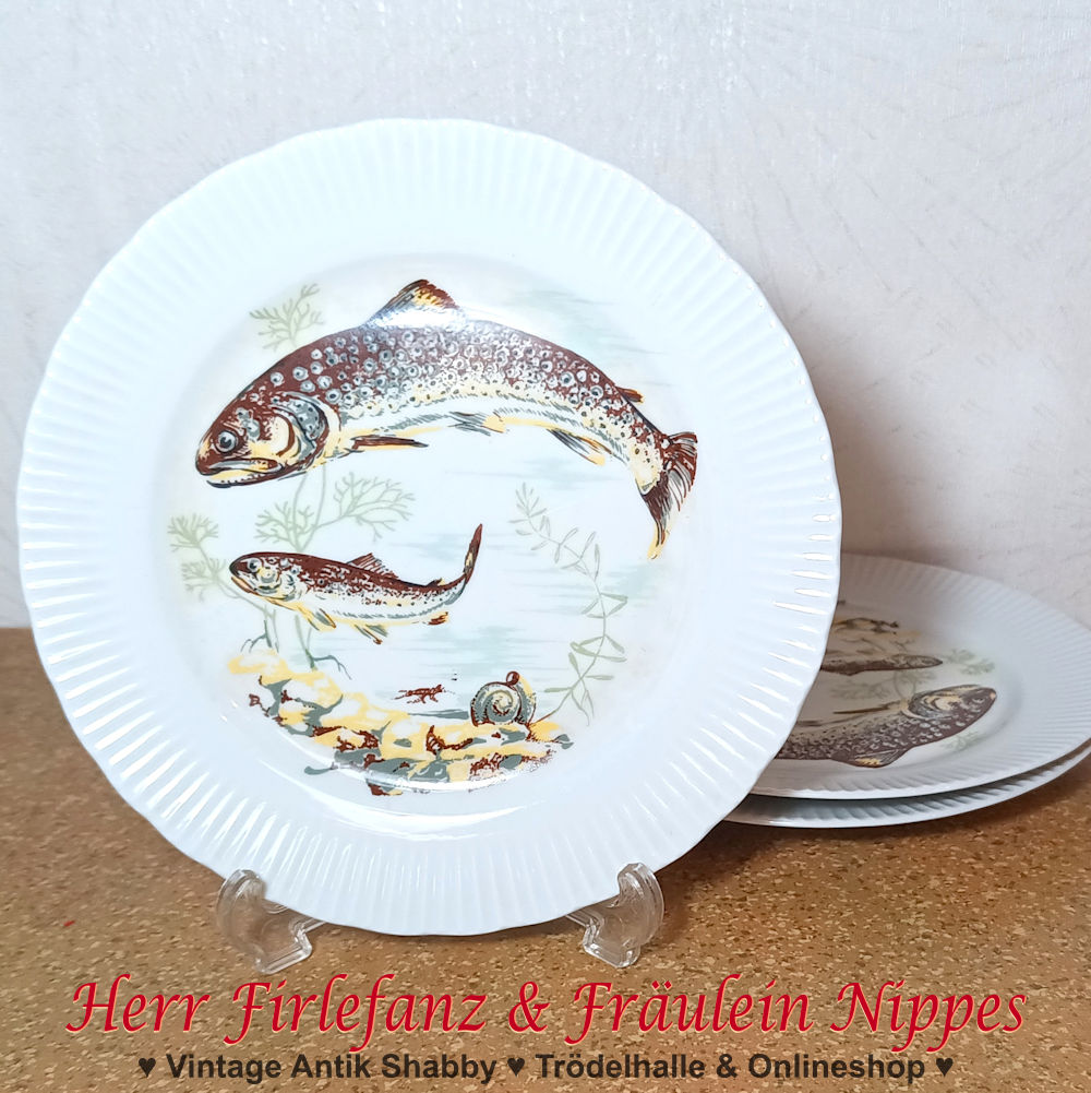 Diese kleinen Vintage Porzellanteller aus DDR Zeiten haben ein Unterwasser Dekor mit 2 Fischen insbesondere Karpfen.