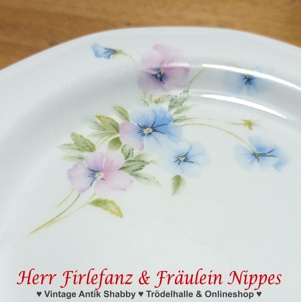Sie sind weiß und haben ein Dekor aus rosa und hellblauen Stiefmütterchen oder auch Veilchen.